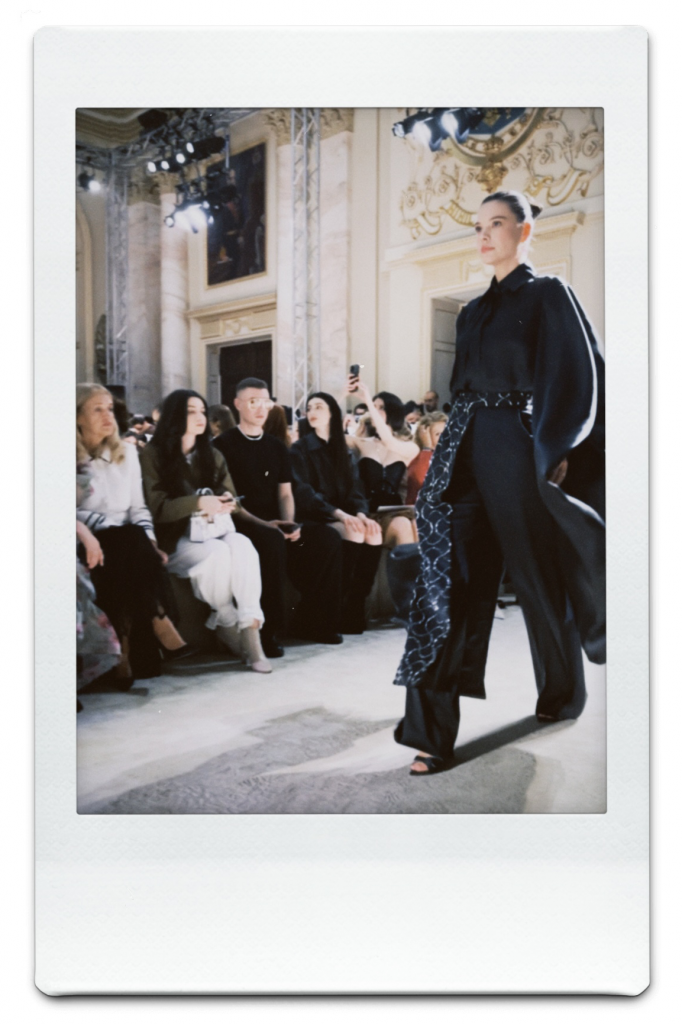 Rochiile din chiffon de mătase aveau o calitate aproape cinematografică și mi-au amintit inevitabil de imaginea lui Galadriel (interpretată de Kate Blanchett in filmul Lord of the Rings) în scena când coboară scările, într-un echilibru perfect dintre gravitație și levitație. În contrapunct, piesele construite din Mikado de mătase sau gabardină de lână ancorau colecția într-o arhitectură clară și intenționată.